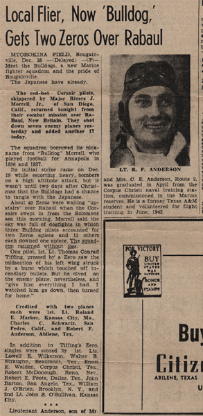 "The Marines have a new fighter squadron nicknamed the 'Bulldogs' and they are the pride of a Bougainville base. In two days of combat last week the Marine Corsair pilots downed 24 Jap planes. Skippered by Major Rivers Morrell, Jr. of San Diego, Calif. The squadron attacked Rabaul in New Britain. The pilots adopted the nickname from the Major who was known as Bulldog Morrell when he played football for Annapolis in 1936-1937. Morrell's men made their first attack on Dec. 19th when they escorted heavy bombers. But it wasn't until this week that the Bulldogs had a chance to tangle with the Japanese. About 40 zeros were waiting over Rabaul when the American Corsairs swept in over the target Morrell says the sky was full of dogfights. That was the day when three Bulldog pilots accounted for two Japs apiece and 11 other American Marine Fliers downed one apiece. Typical of the Bulldog quality of his men, Morrell explains in the action of one pilot. '1st LT. Thomas Tiffing with a Zero on his tail said the midsection of his left wing was struck but he swung and dived at the enemy plane and knocked the Zero out of the sky.' The Bulldogs who chalked up two planes each are 1st LTs. Roland Marker of Kansas City, Mo., Charles Schwartz of San Pedro, Calif., and Robert Anderson of Abilene, Texas. In addition to Tiffing's Zero, singles were scored by 1st LTs. Lowell Wilkerson and Walter Straughn of Beaumont, Texas, Ennis Walden of Corpus Christi, Texas, Robert McDonlaugh of Reno, Nevada, Robert Foote of Dallas, Texas, John Barton of San Angelo, Texas, William O'Brien of Brooklyn, New York and 2nd LT. John O. Sullivan of Kansas City, Mo."