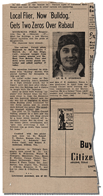 Hooray for the Bulldogs! Sunday morning after check-in and before I went home to bed I went by the newspaper to get a paper before I went home and did I find a pleasant surprise on page two. I'm enclosing a copy of it. Naturally I knew then just what I had been dying to find out. Exactly where you were and the action you might be involved in. I highballed it over to the store and woke up Mother and Dad and they were tickled to death. I'm not positive but I think I know John Barton of San Angelo. Tell Bob Anderson that I gave his mother and dad one of the clippings and they were very happy. We're really proud of you fellows. I think if we were any prouder we'd surely bust.
