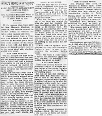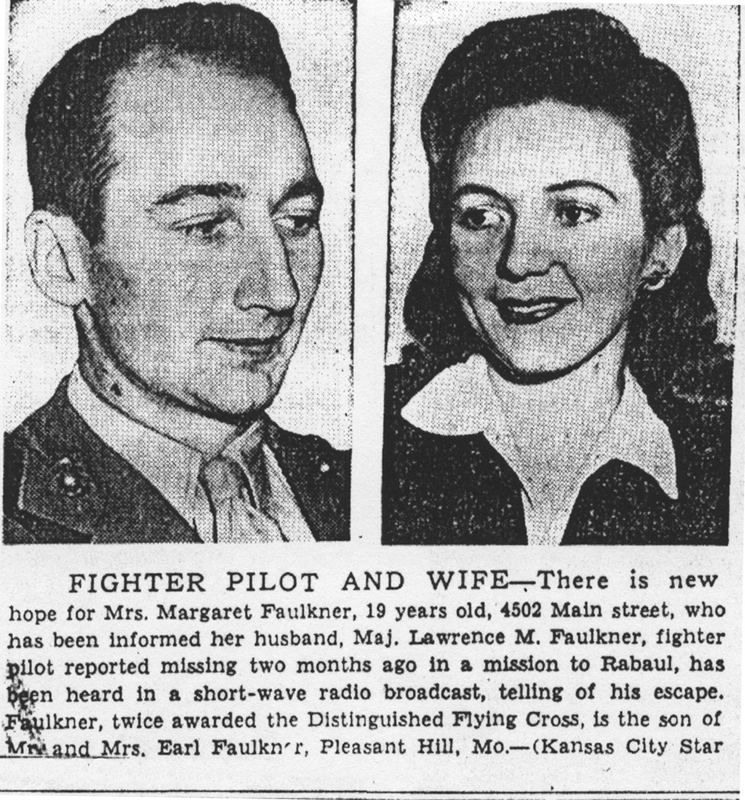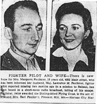 Our grandaughter's name is Alice Marie Rhodes. My name is also Marie. We really are repeating the name Marie, but her father insisted on the name and she is named for both grandmothers, as Mrs. Rhodes name is Alice. The grand-Baby subject is a very delightful one to me. But on second thought it could be a very boring subject except to us grandmothers, don't you agree? -- Our son-in-law is expecting to leave for the service sometime in April and our daughter & baby will come home for the duration. They have a nice home about 6 blocks from us. They will rent it out. She will stay in her own home but she's not well, (expecting in July) so her husband & us tho't it would be better for her to come home. We are moving out of two rooms & letting her light-house-keep. We have a large house (8 rooms 5 of them 16 ft. X 16 ft. -). All this is planned in case he passes all examinations. It seems like I don't know much news. We appreciated you copying the letter from Lt. Martin, it was very interesting. Write again when ever you have the time. Sincerely Mr. and Mrs. Faulkner P.S. Here is a clipping that appeared in the K.C. Star after an interview with Lawrence's wife. |